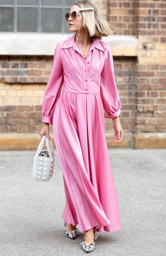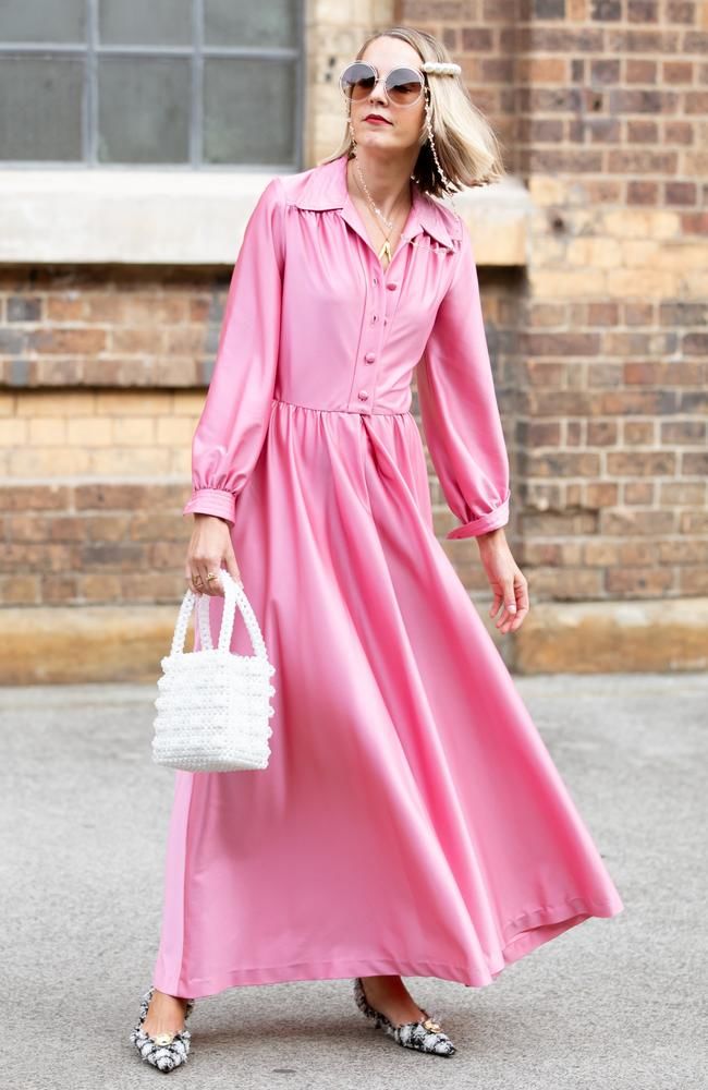 Her ’70s dress was the staple she teamed with a pair of Balenciaga shoes, white beaded bag from Etsy and sunglasses from Chloe.