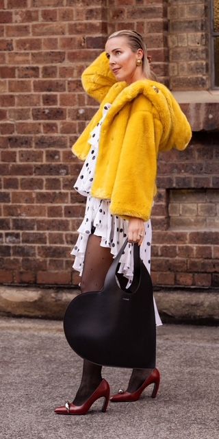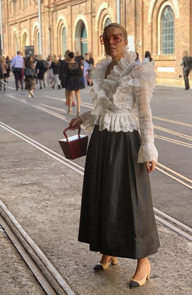 On day two of the event at Carriageworks, it was all about over-the-top ruffles. She paired her Vinnies skirt (under $10) from the Hills District in Sydney with a white ruffled top from international designer Loeil. Her shoes were slingback blocks from Chanel.